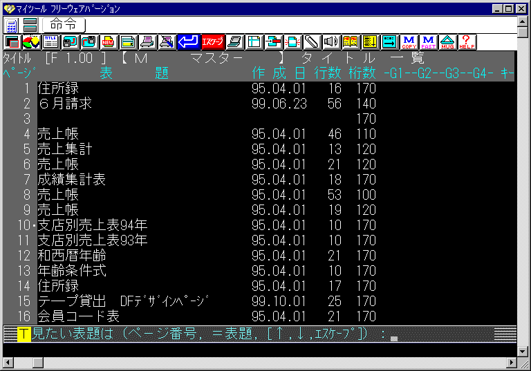 | マイツールのファイルやフロッピーに、何を書込んでいるか、確認するにはT命令を使います。 T命令を実行すると、ファイルやフロッピーに書込んだデータの表題一覧が、画面に表示されます。 |