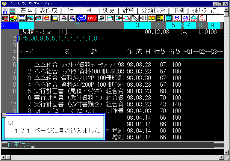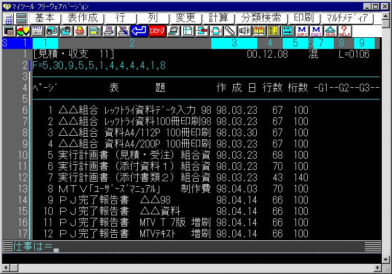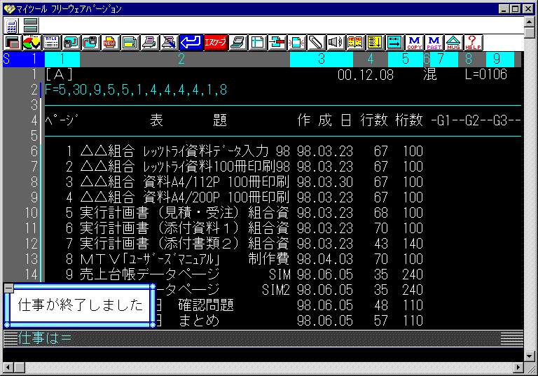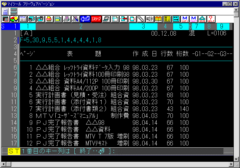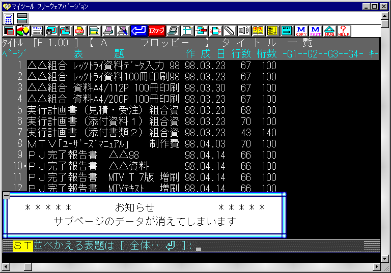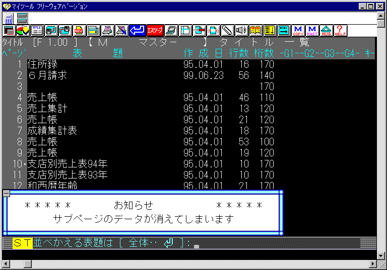 「並べかえる表題は」の状態で、[Enter]キーのみを押します。 [Enter] 画面の表題一覧が、マイツールの表として画面に表示されます。また、同時にサブページの1ページ目から書き込まれます。 |
