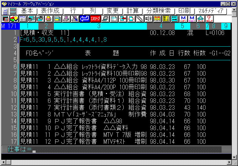 | 作成した表題の一覧に、フロッピーの種類がわかる列を追加しておくだけで、必要なデータをどのフロッピーに書込んでおいたか、表題や作成日から検索することができます。