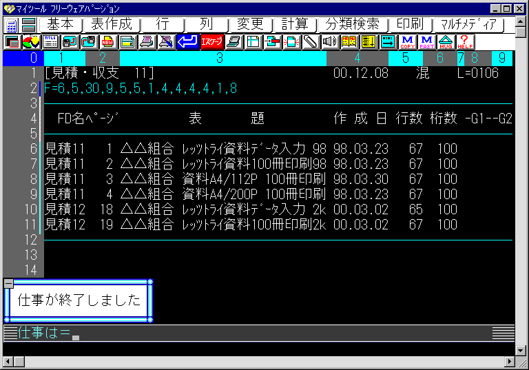 「仕事は=」の状態で、“T[Enter]”と入力すると、現在のファイルの表題一覧が表示される。